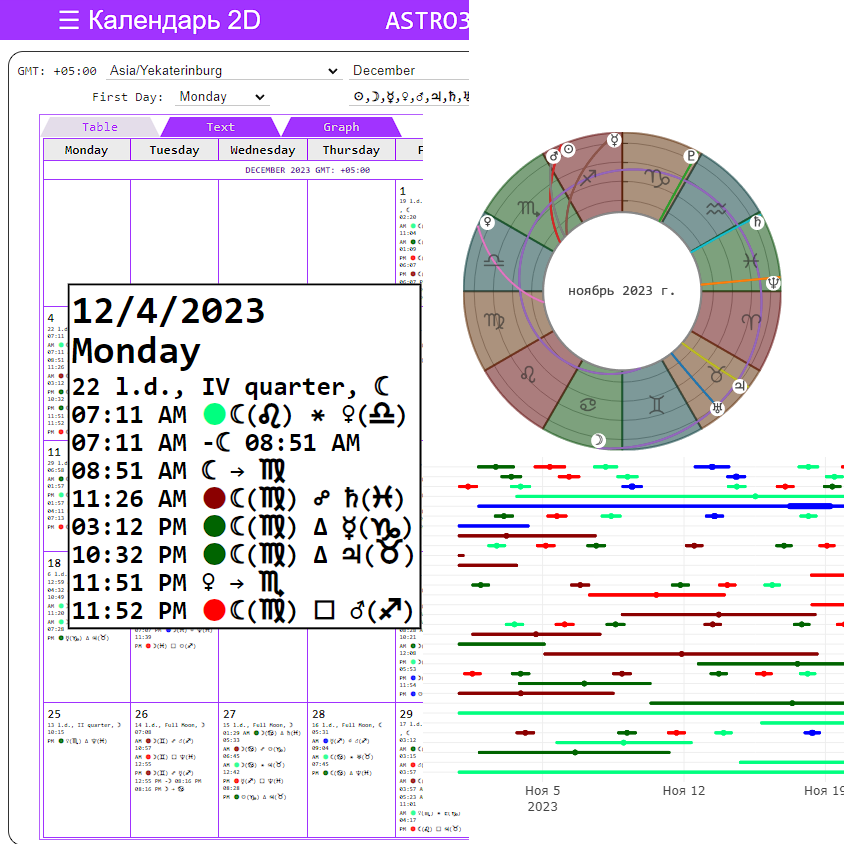 Можно сохранять картинку, выбирать планеты, аспекты, временную зону.